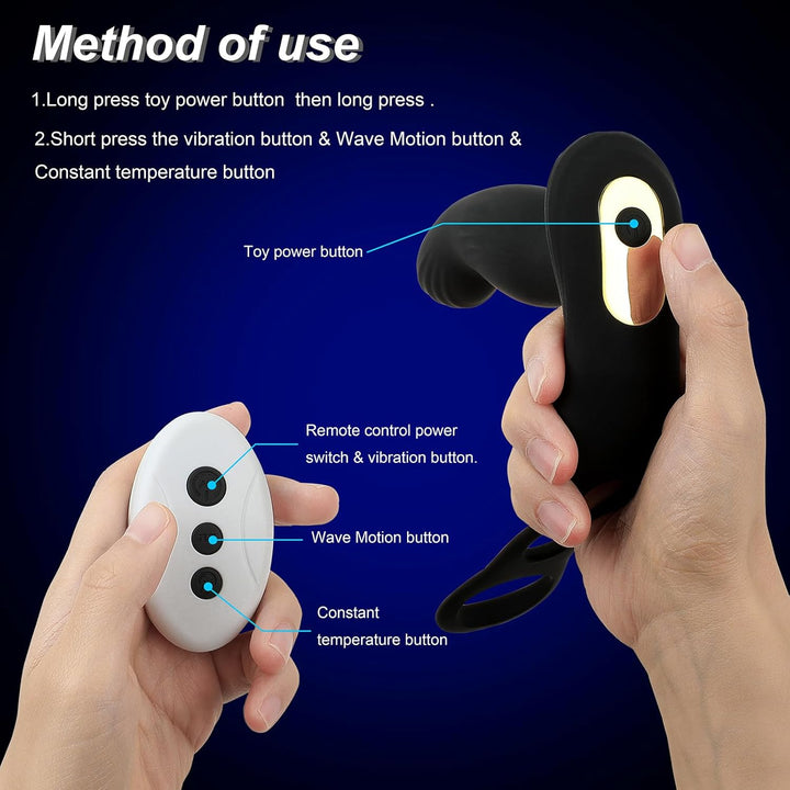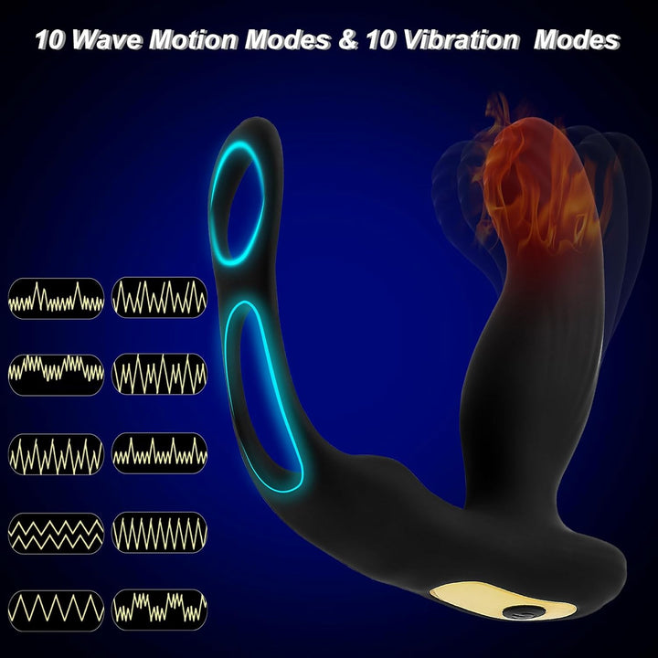 - 【New Upgraded Anal Vibrator】- 10 wave motion modes like finger wagging massage,Celsius intelligent constant temperature,10 Vibration Modes,Adjust from mild to severe to regular vibration by remote control,Vibration and wave motion and heating can work at the same time,two rings can lock your penis & ball,Bring a new massage experience to your prostate.
